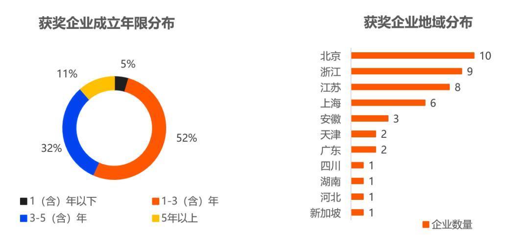 地域分布:获奖企业所在地域前三甲分别是北京、浙江和江苏,其中,10家企业集中在北京,分别有9家和8家企业分布在浙江和江苏,紧随其后的是上海和安徽。本次获奖企业中还有1家新加坡医疗科技企业。凭借丰富人才资源及活跃创业环境,北上浙苏区域成为大量硬科技初创企业汇聚地。